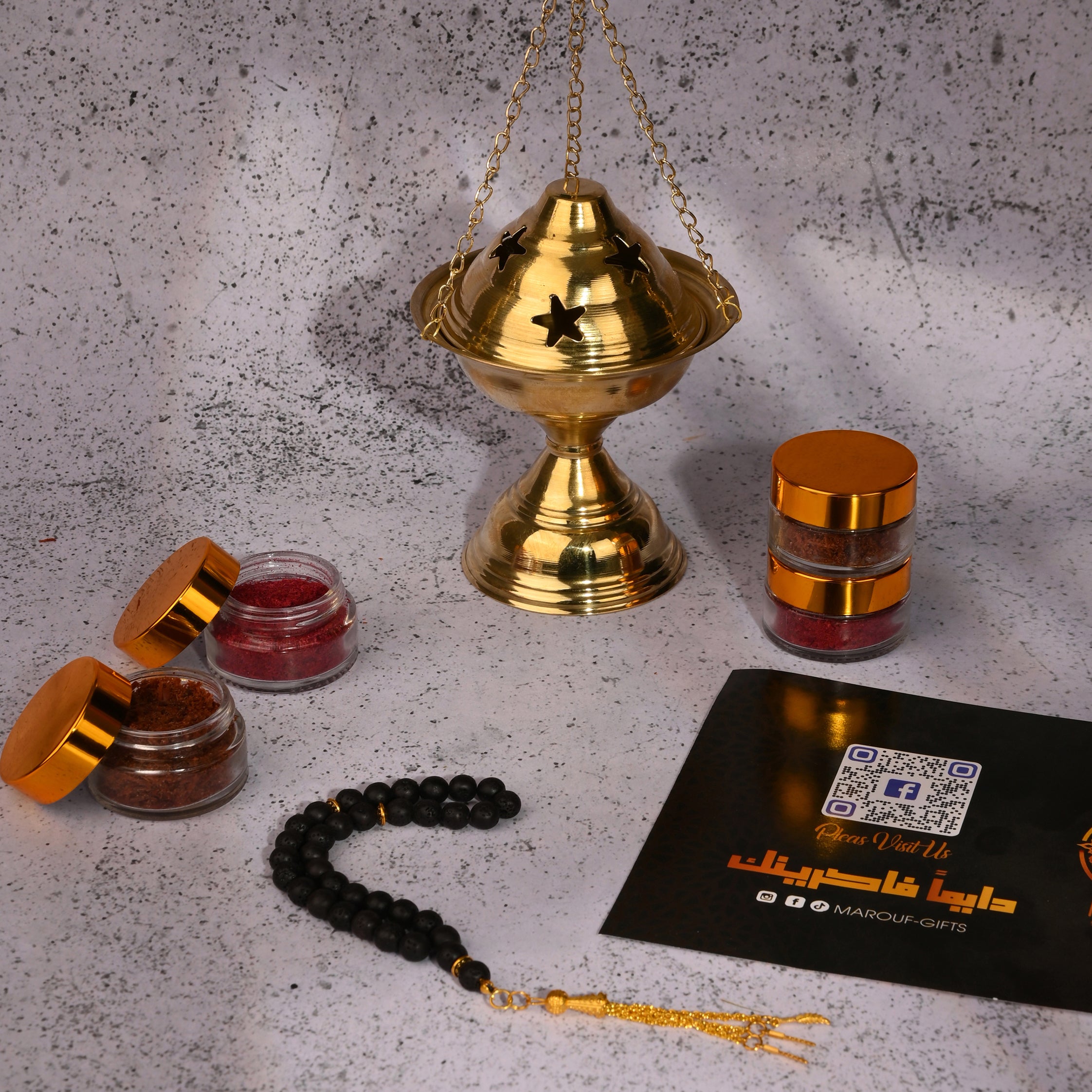تحفة مستوحاة من الفن العثماني الأصيل، مصنوعة يدويًا من الخشب الطبيعي المطعّم بالصدف لتجسد الفخامة الشرقية. يضم مصحفًا عثمانيًا جلديًا فاخرًا، رشية ذهبية لمتابعة الخاتمة, سبحة من العقيق السليماني بزيت المسك، مجموعة من أفخم العطور الشرقية (المسك الأبيض، الأحمر، الغزال الأسود، العود الإماراتي) ،...