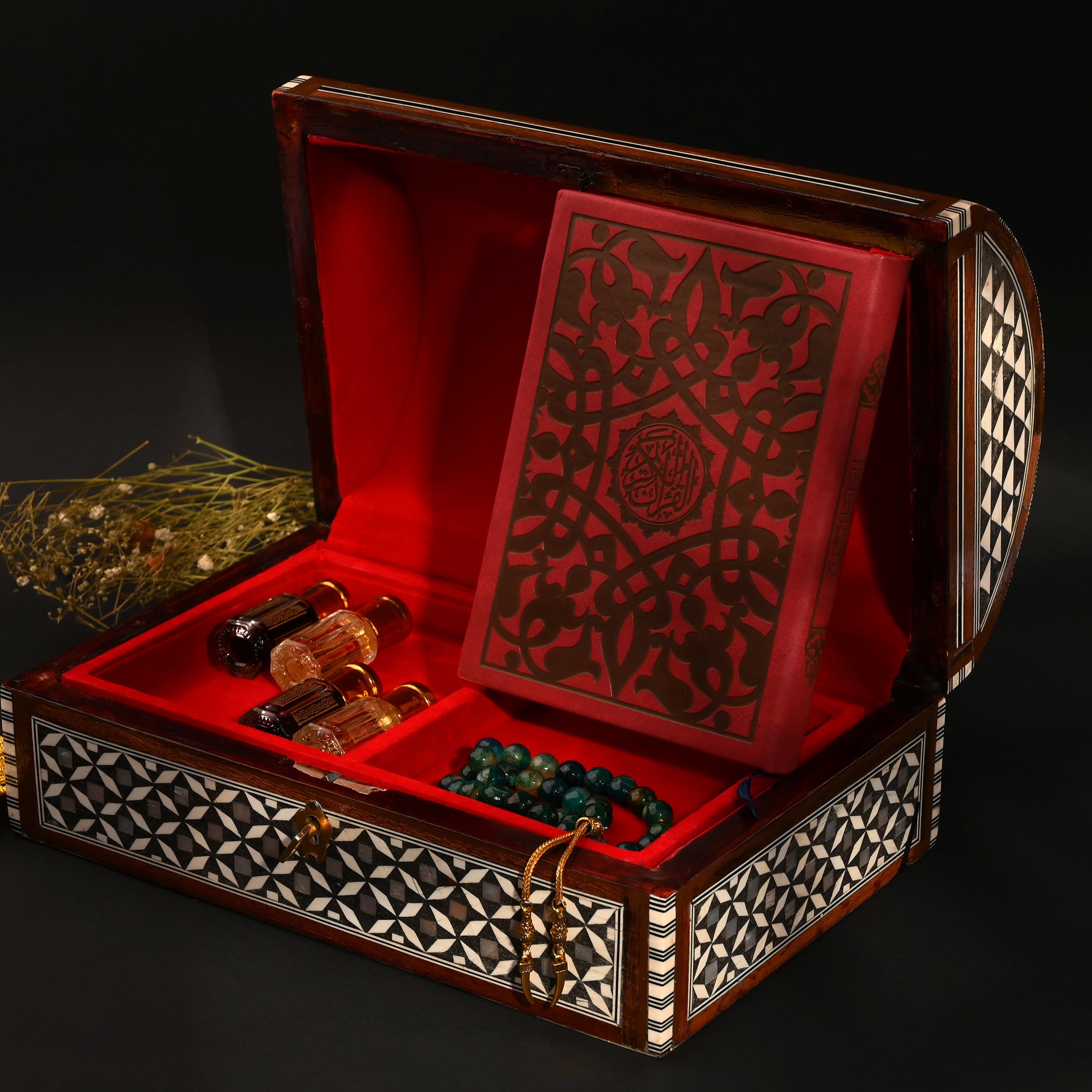 تحفة مستوحاة من الفن العثماني الأصيل، مصنوعة يدويًا من الخشب الطبيعي المطعّم بالصدف لتجسد الفخامة الشرقية. يضم مصحفًا عثمانيًا جلديًا فاخرًا، رشية ذهبية لمتابعة الخاتمة, سبحة من العقيق السليماني بزيت المسك، مجموعة من أفخم العطور الشرقية (المسك الأبيض، الأحمر، الغزال الأسود، العود الإماراتي) ،...