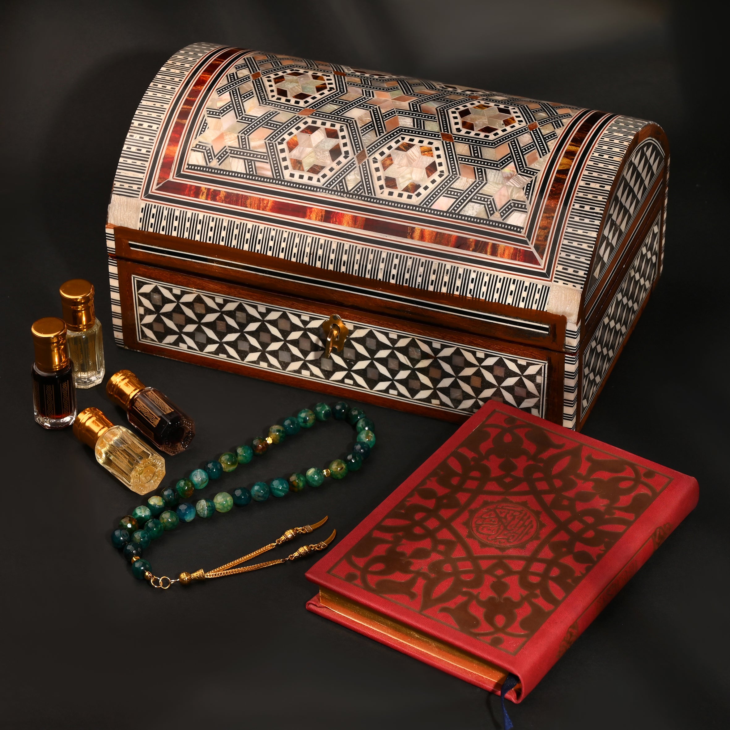 تحفة مستوحاة من الفن العثماني الأصيل، مصنوعة يدويًا من الخشب الطبيعي المطعّم بالصدف لتجسد الفخامة الشرقية. يضم مصحفًا عثمانيًا جلديًا فاخرًا، رشية ذهبية لمتابعة الخاتمة, سبحة من العقيق السليماني بزيت المسك، مجموعة من أفخم العطور الشرقية (المسك الأبيض، الأحمر، الغزال الأسود، العود الإماراتي) ، لتكون الهدية التي تجمع بين الفن والروح.