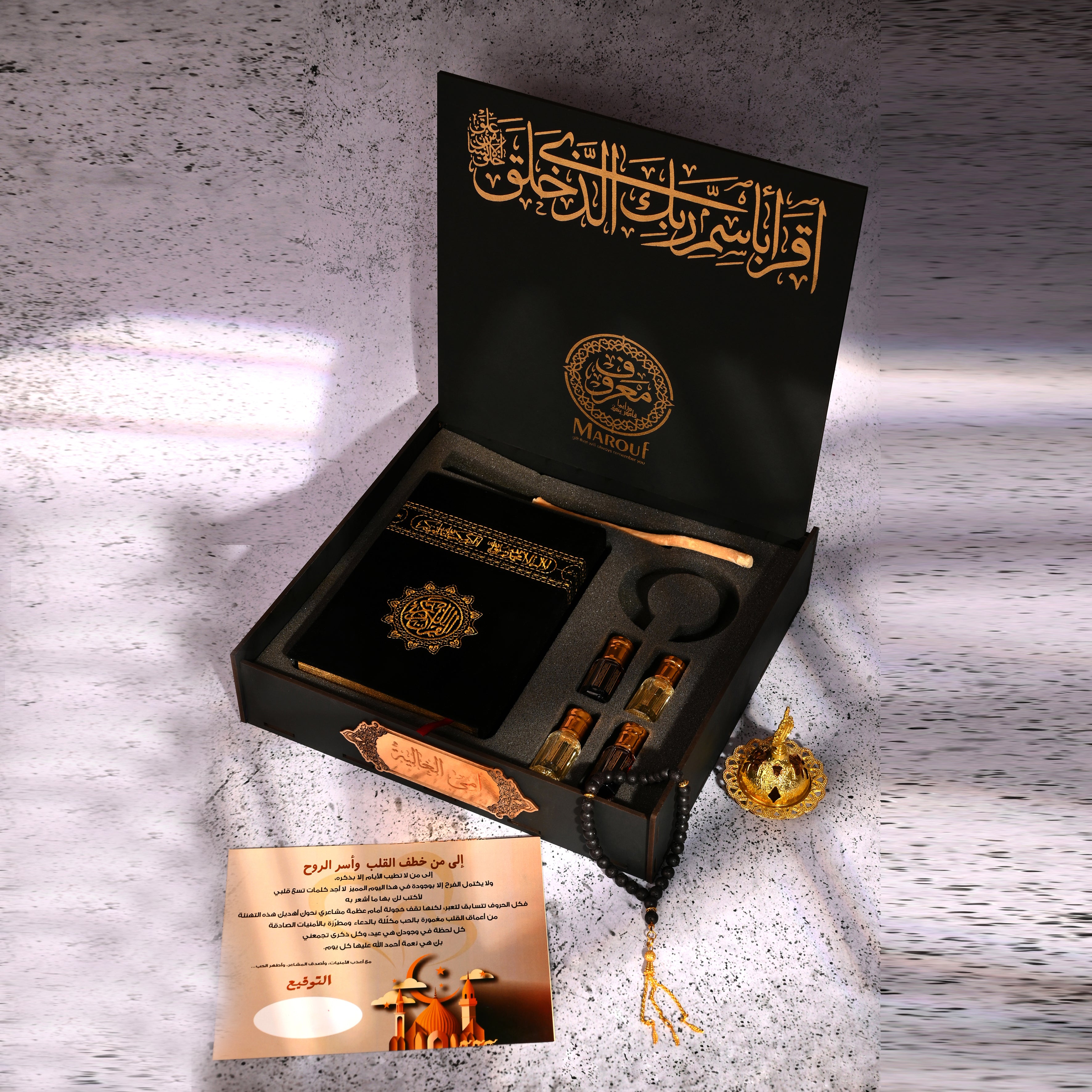 تحفة مستوحاة من الفن العثماني الأصيل، مصنوعة يدويًا من الخشب الطبيعي المطعّم بالصدف لتجسد الفخامة الشرقية. يضم مصحفًا عثمانيًا جلديًا فاخرًا، رشية ذهبية لمتابعة الخاتمة, سبحة من العقيق السليماني بزيت المسك، مجموعة من أفخم العطور الشرقية (المسك الأبيض، الأحمر، الغزال الأسود، العود الإماراتي) ،...