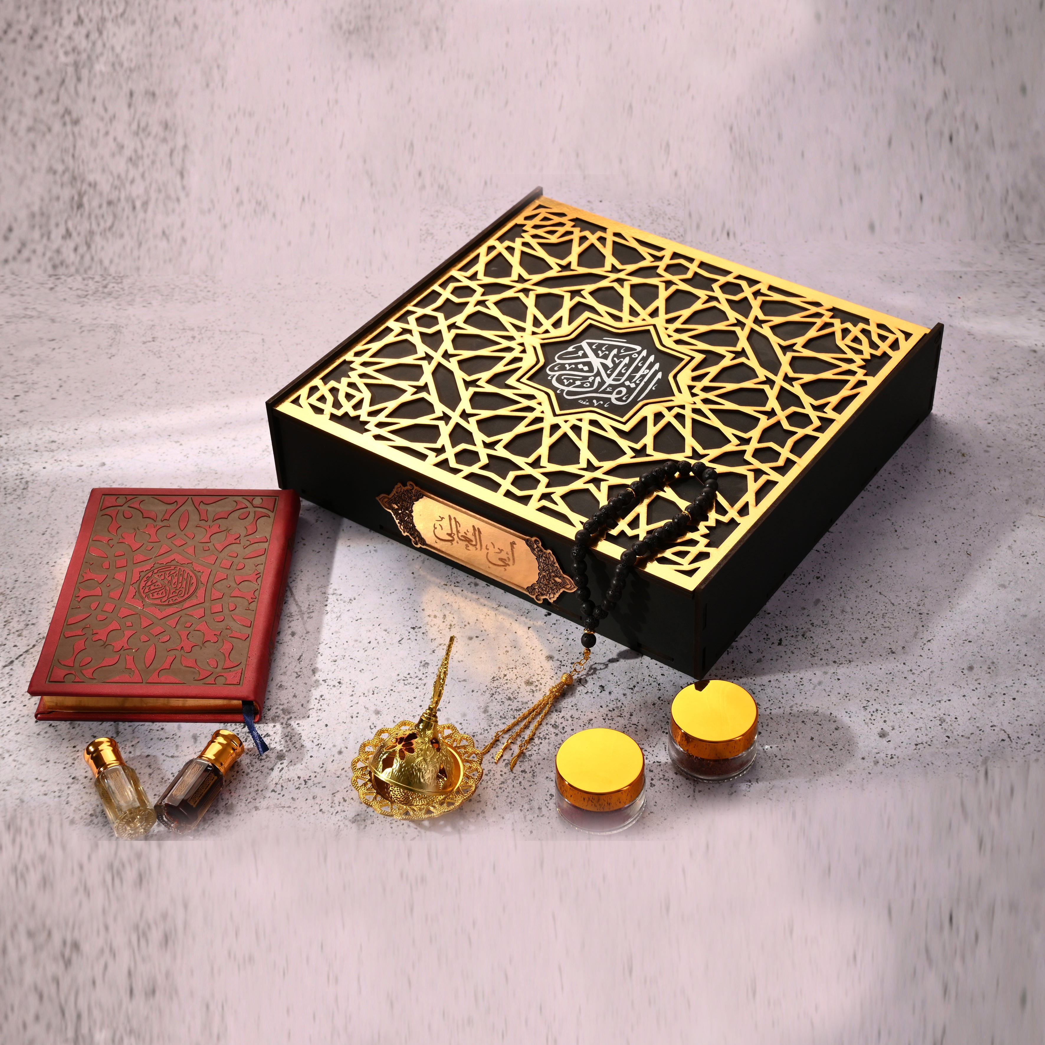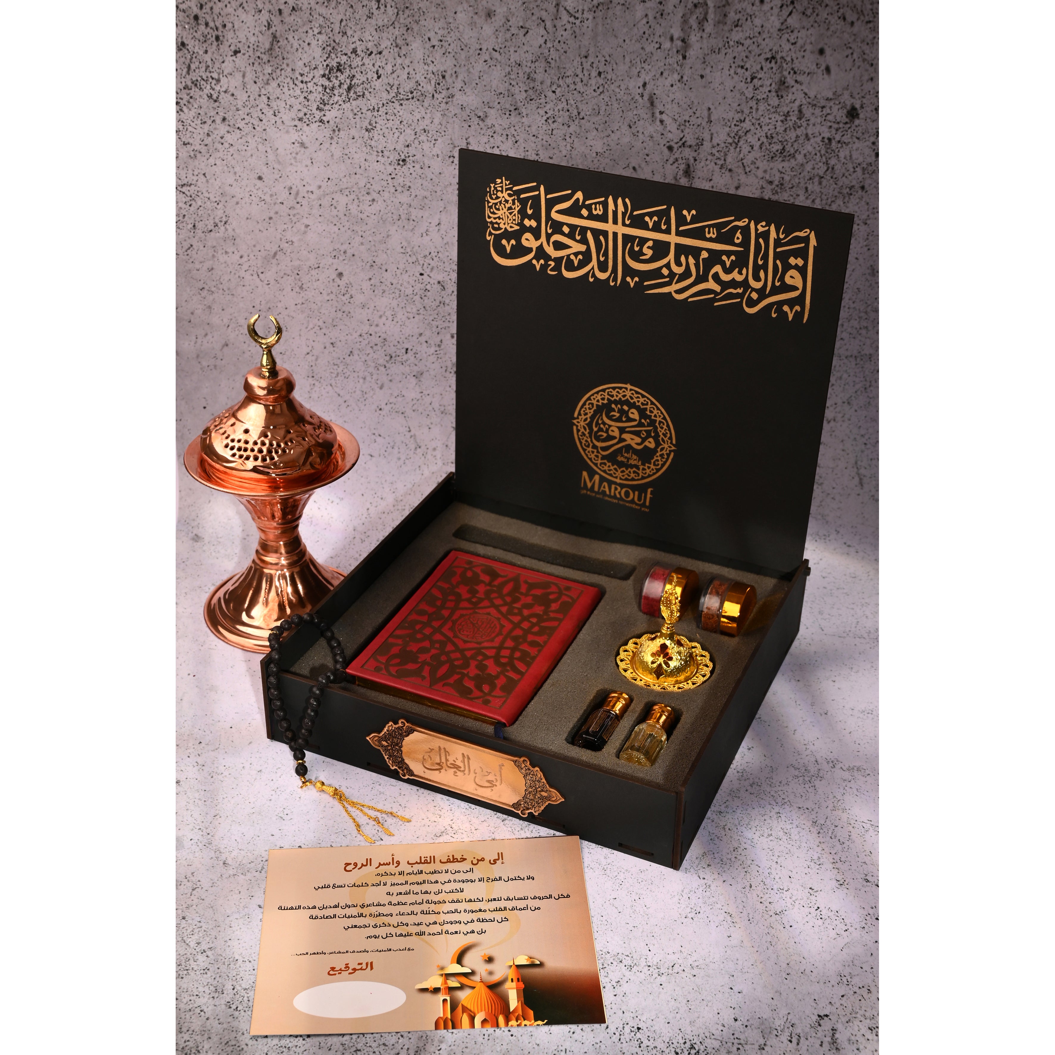بوكس يحمل روح الأصالة وعبق الذكرى في تصميمٍ فاخر من الأسود والذهبي. يحتوي على مصحف عثماني جلدي فاخر، رشية ذهبية لمتابعة الخاتمة، سبحة من حجر الحمم بزيت المسك، عطور المسك الأحمر والأبيض، مبخرة نحاسية أنيقة مع علبتين بخور شرقي فاخر، لتصبح هدية تعبّر عن الذوق الرفيع والذكرى العطرة, مع إمكانية حفر الاسم بالليزر لتصبح الهدية أكثر خصوصية وتميّزًا.